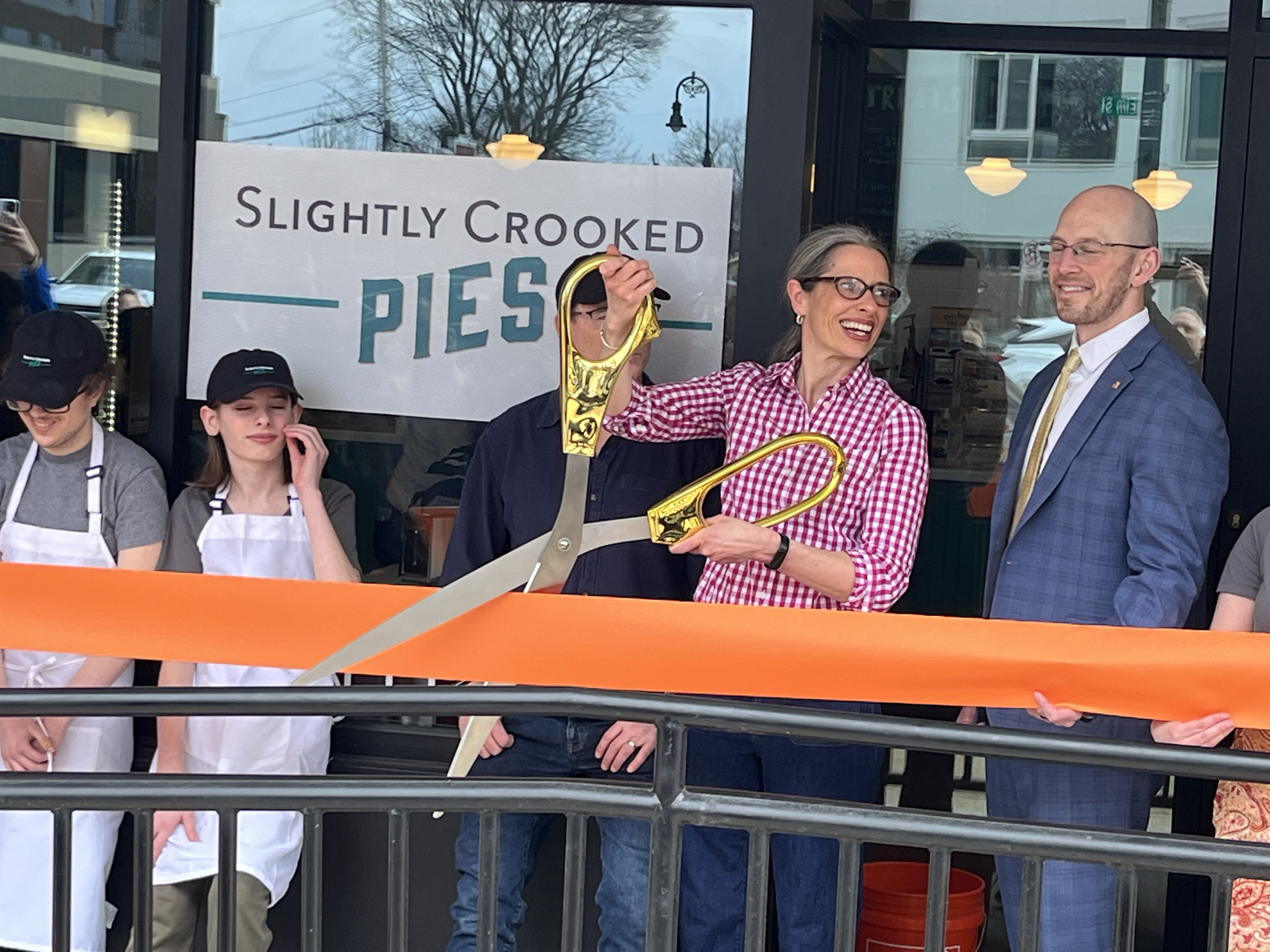 Flanked by her husband, Drew, left, and Manchester Mayor Jay Ruais, Lauren Collins Cline cuts the ribbon during the opening celebration for Slightly Crooked Pies on Elm Street in Manchester on March 26. At left is Rohan Cline and Sebastian Cline. (Mike Cote)