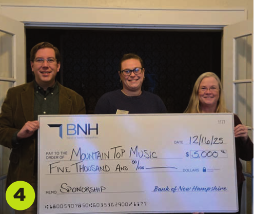 4. Bank of New Hampshire announced its sponsorship of Mountain Top Music Center’s 2026 Concert Series as a $5,000 season sponsor. Mountain Top Music Center in Conway offers music education for all ages as well as performances around the region. From left are Mountain Top Music Center Executive Director George Wiese; Katelyn Quint, banking office manager of Bank of New Hampshire’s Conway office; and Dr. Therese Davison, Mountain Top Music Center trustee.